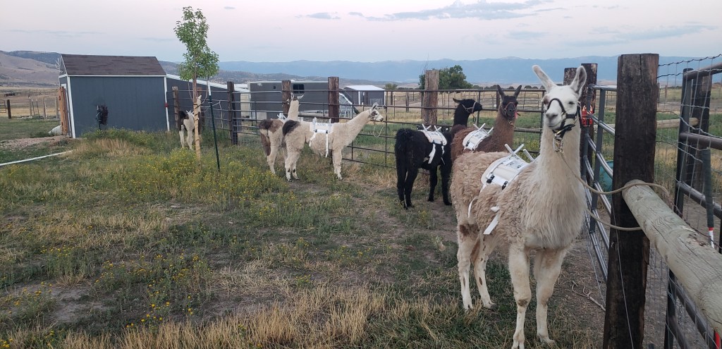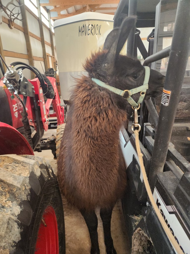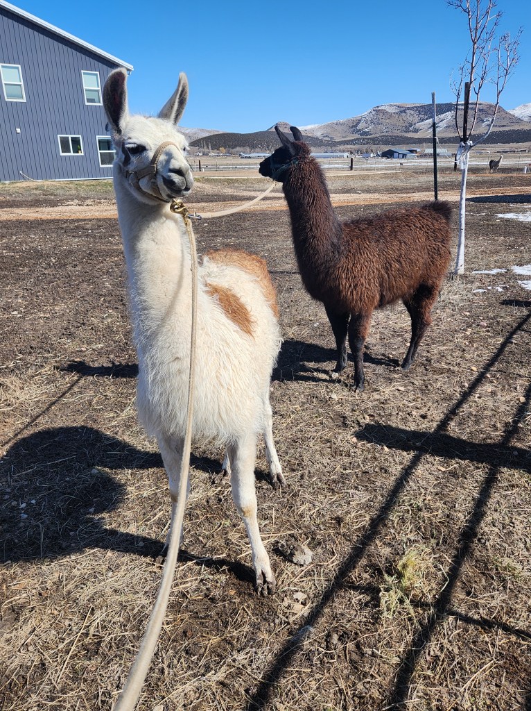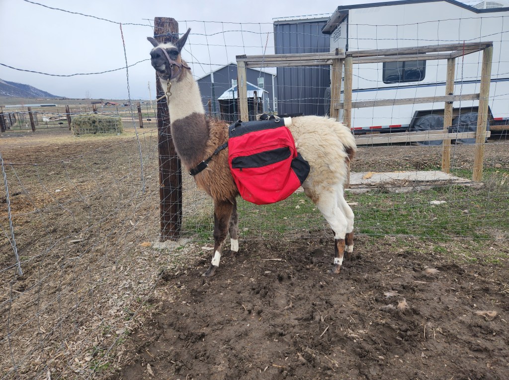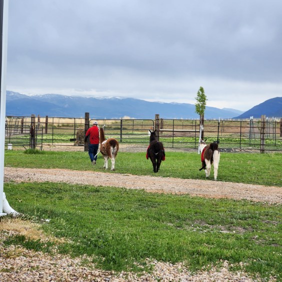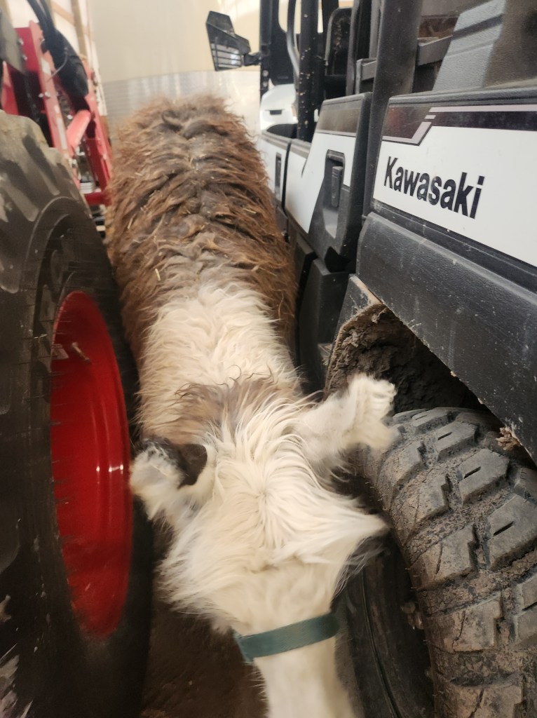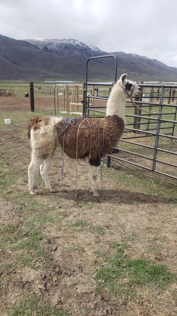 Mar. 23, 2024: we had a good chunk of the day available for training before storms rolled in later in the day. Our weanlings did more good work on desensitization, leading, new surfaces, and some obstacles. We try and use what we can in mud season, so took advantage of some tight squeezes in the garage. Many llamas balk at doorways, narrow gates, etc. We use tight spots in training to help them overcome their wariness. This translates to preparedness for tight spots on and off trail in the mountains.