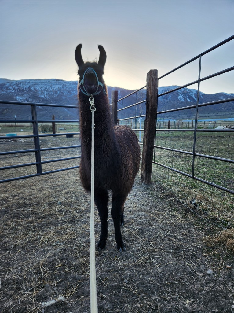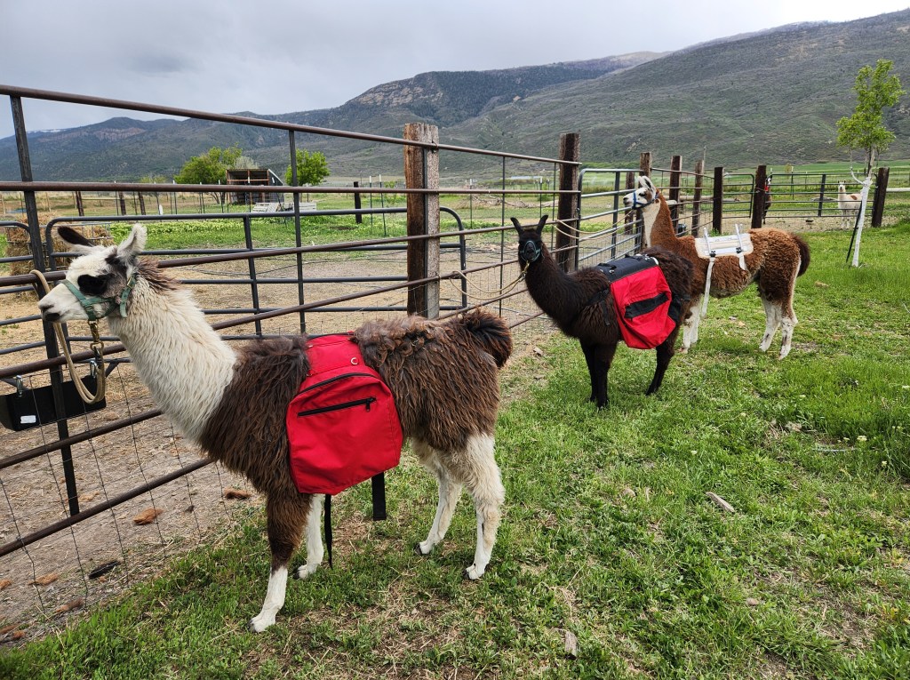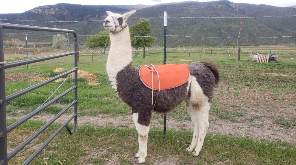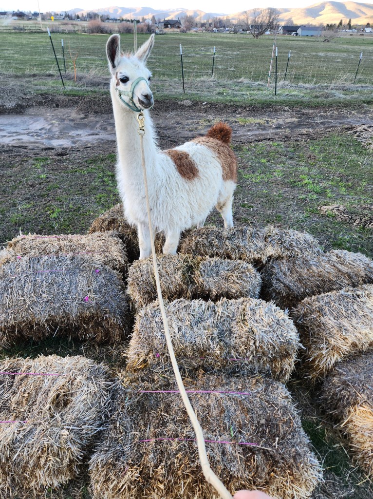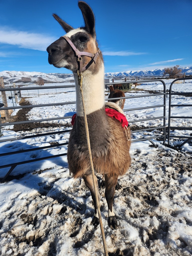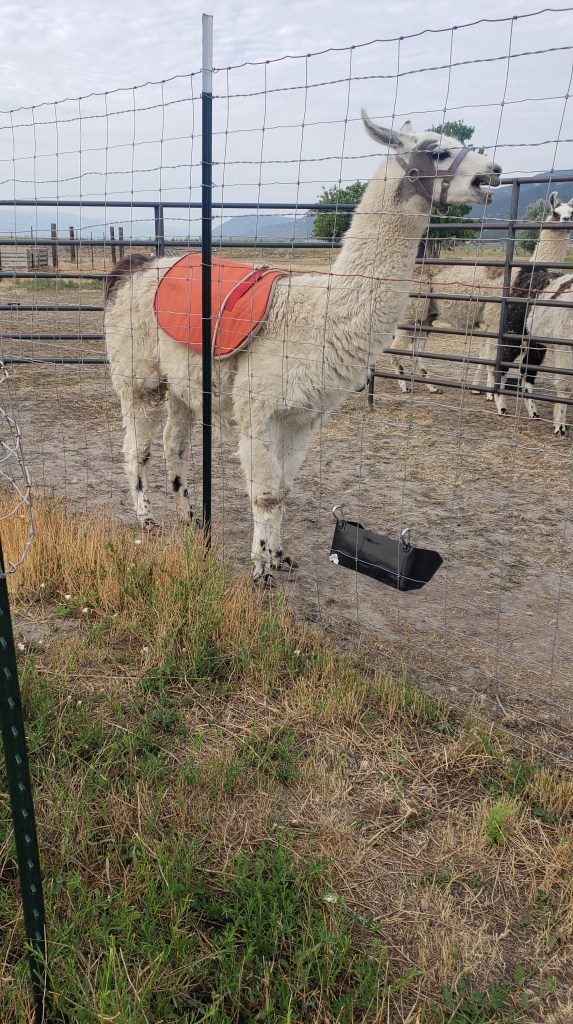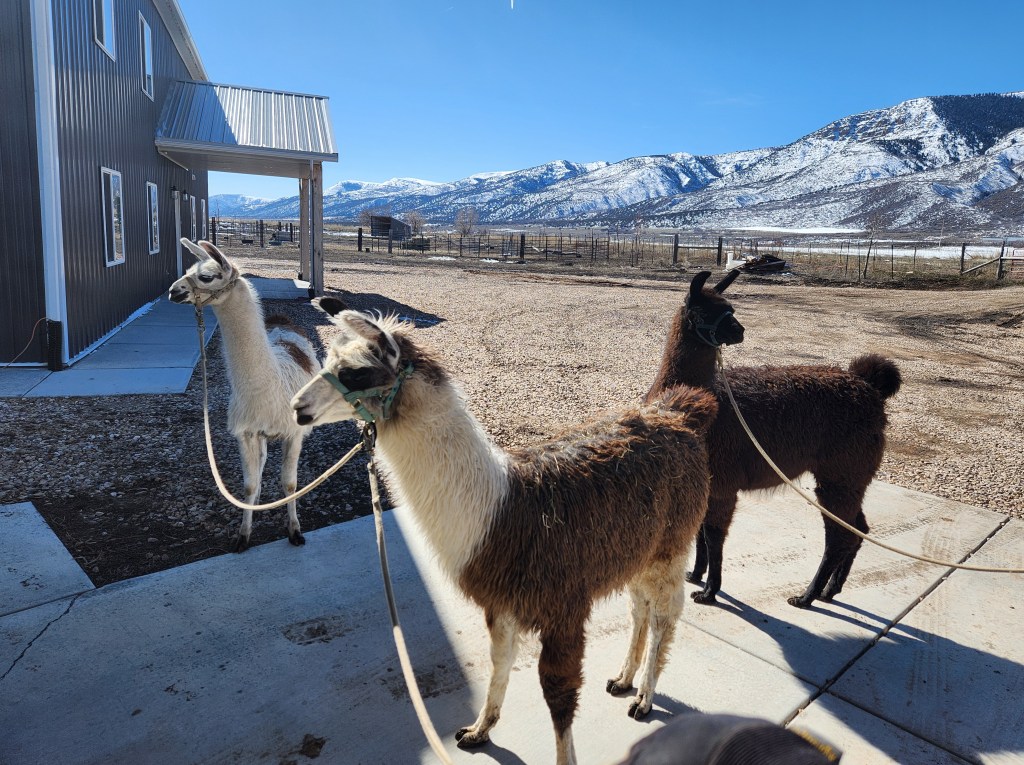 Mar. 23, 2024: we had a good chunk of the day available for training before storms rolled in later in the day. Our weanlings did more good work on desensitization, leading, new surfaces, and some obstacles. We try and use what we can in mud season, so took advantage of some tight squeezes in the garage. Many llamas balk at doorways, narrow gates, etc. We use tight spots in training to help them overcome their wariness. This translates to preparedness for tight spots on and off trail in the mountains.