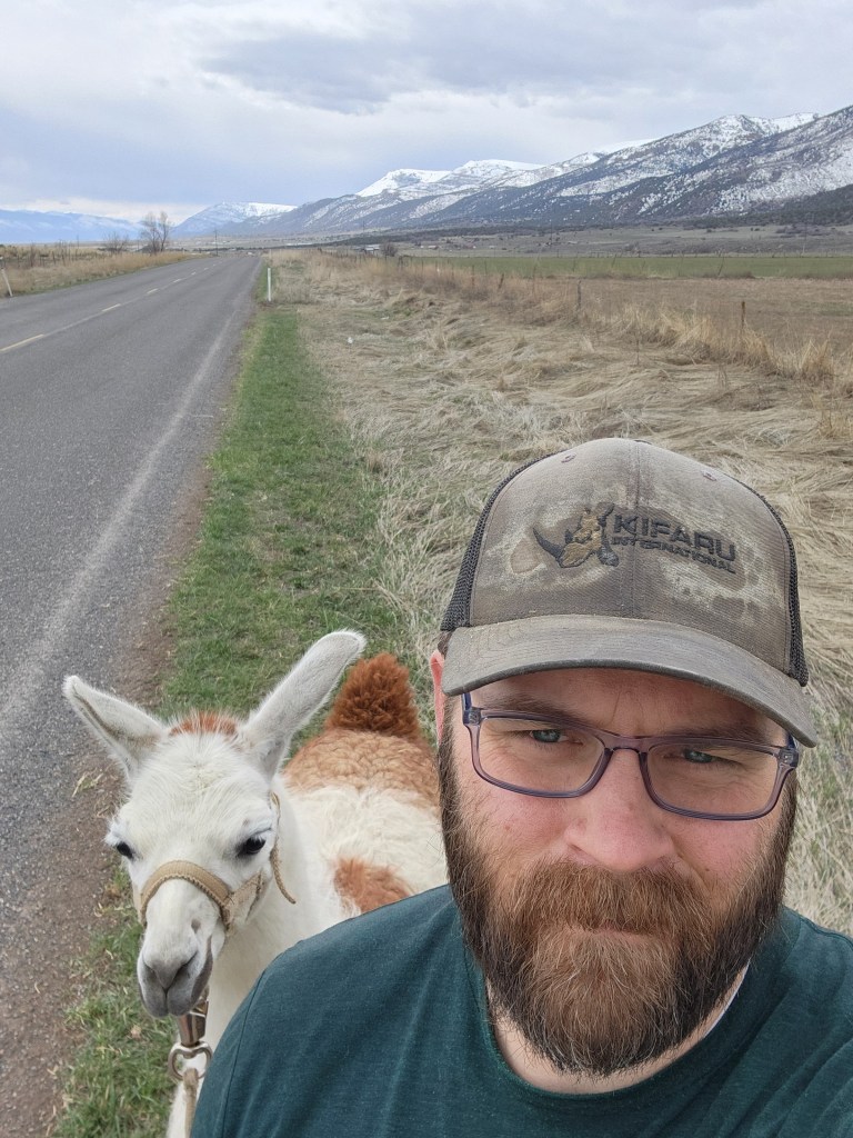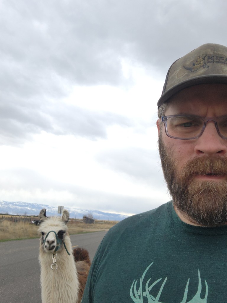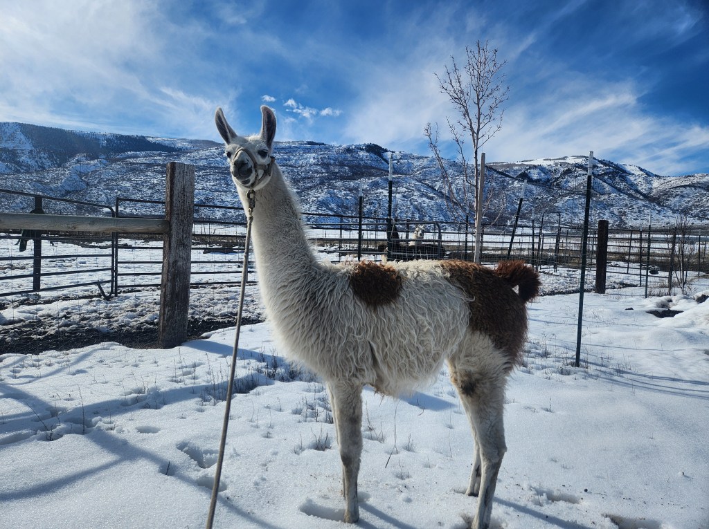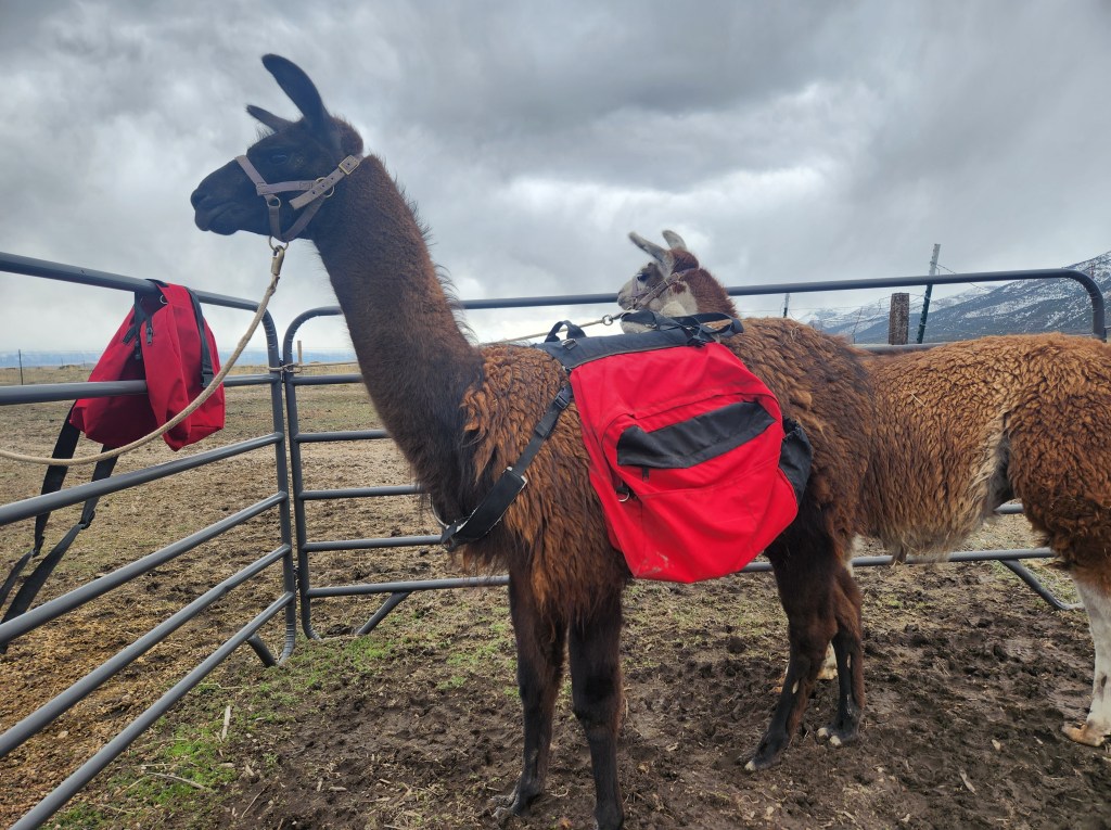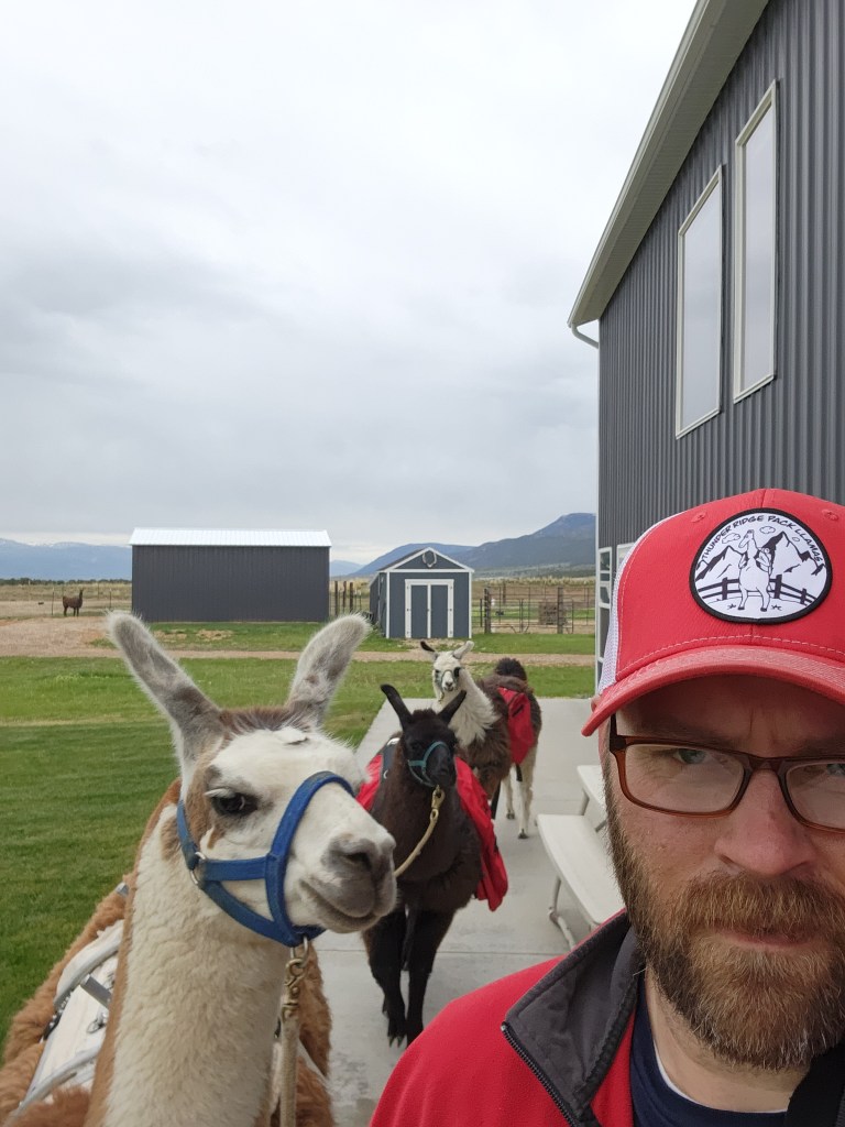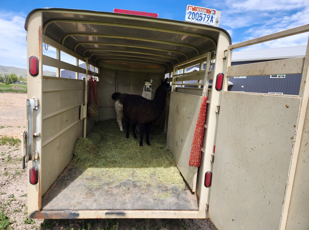 Mar. 23, 2024: we had a good chunk of the day available for training before storms rolled in later in the day. Our weanlings did more good work on desensitization, leading, new surfaces, and some obstacles. We try and use what we can in mud season, so took advantage of some tight squeezes in the garage. Many llamas balk at doorways, narrow gates, etc. We use tight spots in training to help them overcome their wariness. This translates to preparedness for tight spots on and off trail in the mountains.